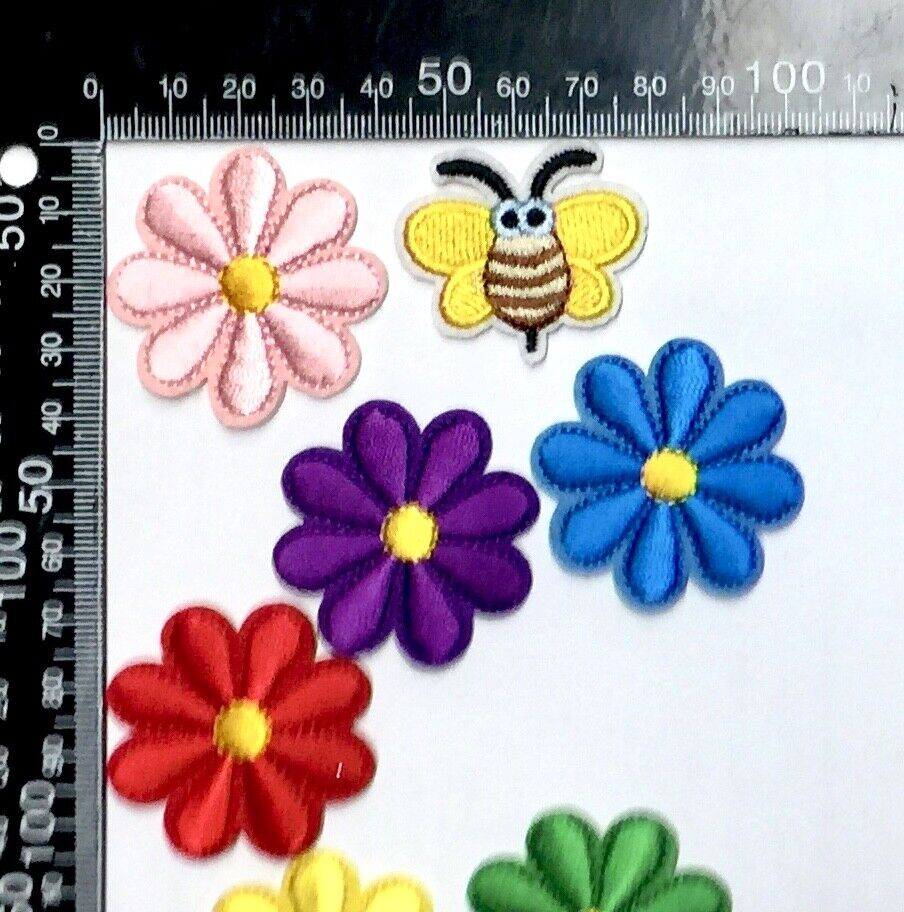 1x Set of 6x Flower & 1x Bee Machine Embroidered Iron On Patches Applique
