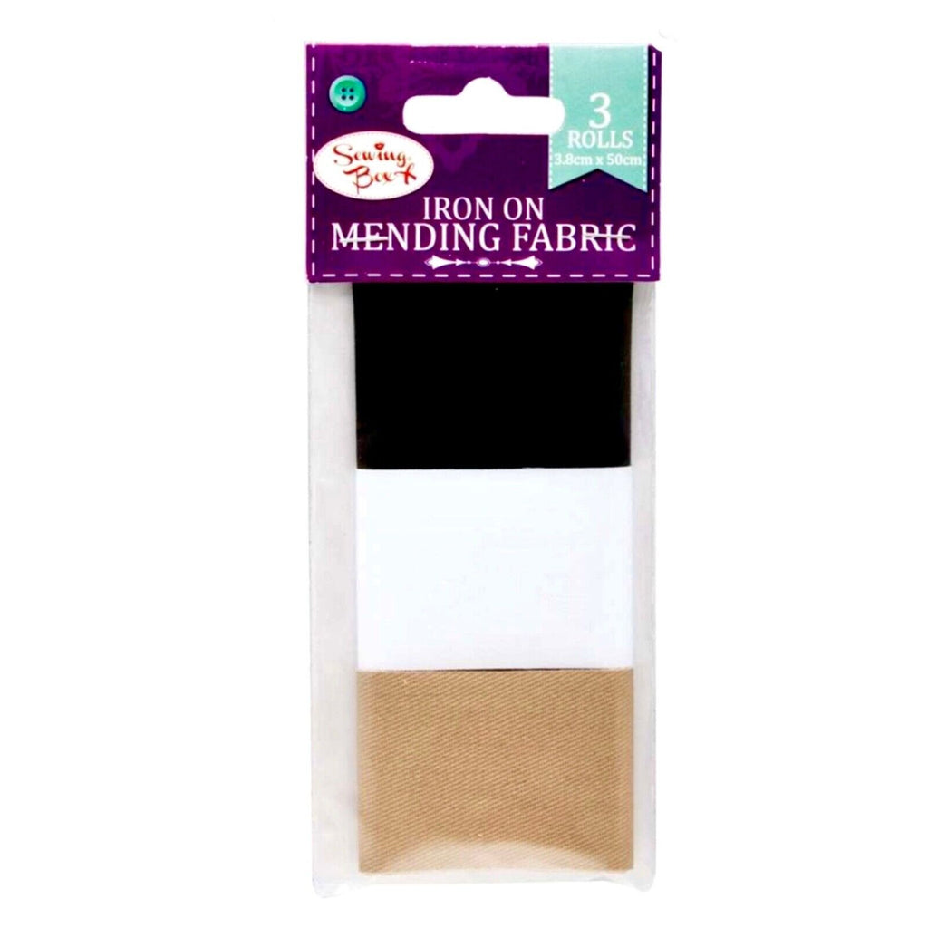 3x Colour Iron On 38MM Mending Fabric - Black, White, Light brown