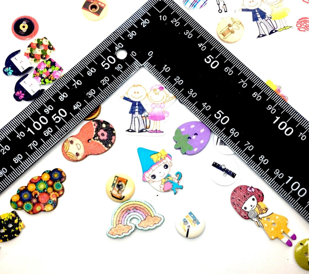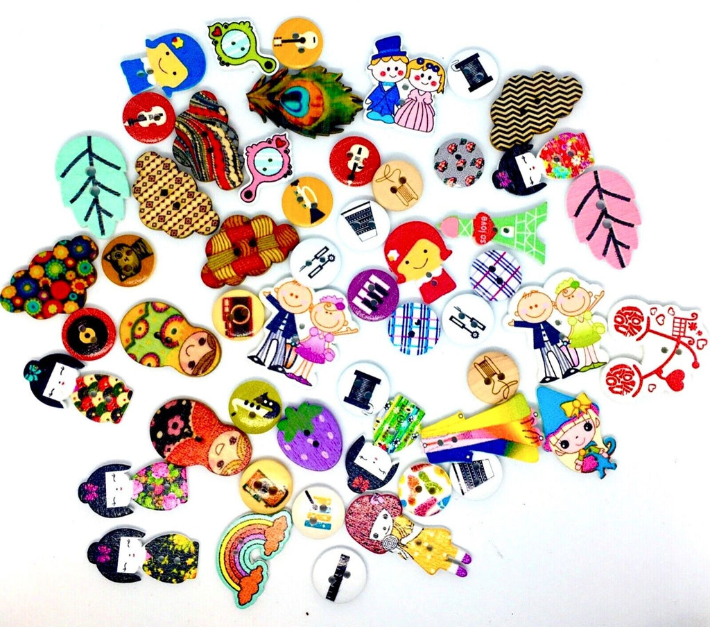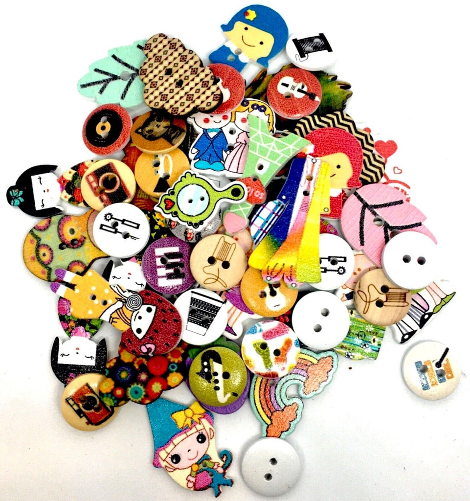 50 pcs of Mix Sizes Mix Colours Mix Cartoon Design Wood Buttons For Crafts and Sewing Embellishment