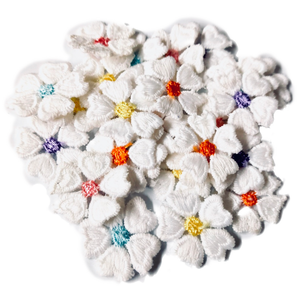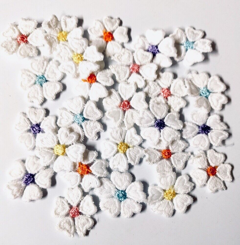 24x White 25mm Heart Petals Multi Colour Center Embroidered Applique Patch