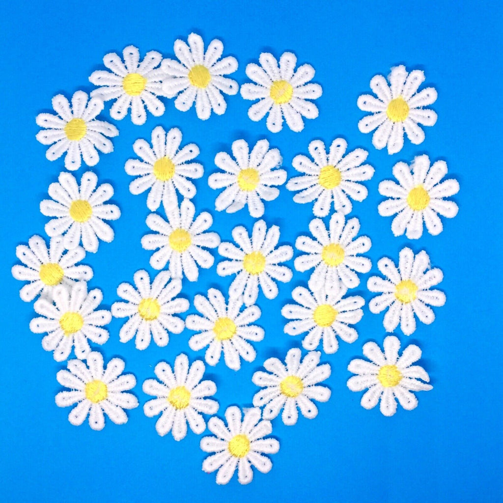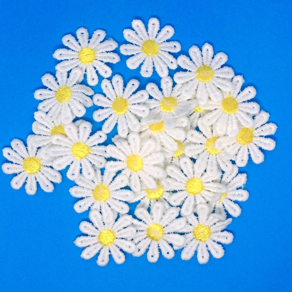 24x Daisy Flower with Yellow Center 25mm Embroidered Giupure Sew on Applique Patches- A beautiful product that can accentuate all your fashion accessories or cards and scrapbooking